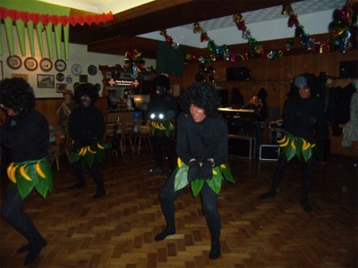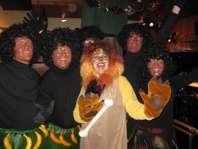 Gleich hinter der Tür zum Saal im Vereinslokal „Grüner Kranz“ in Windischenhaig wurden die Gäste von einem freundlich lächelnden Eingeborenen begrüßt, der entsprechend der aktuellen „Dschungel-Mode“ nur mit einem Röckchen aus Bananenblättern und Bananen bekleidet war. Dahinter trippelte ein adrettes Zebra in den Saal, das sich vermutlich im kuscheligen Dschungellager eine kleine Auszeit vom kalten Winterwetter in der Savanne gönnen wollte.