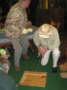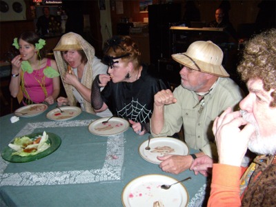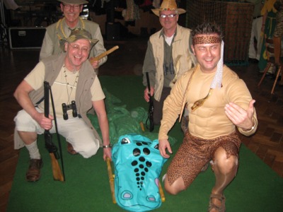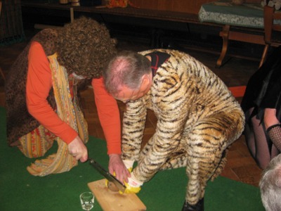 Nach einer weiteren Runde aufregender Erfrischungen wartete auch schon die nächste Überraschung auf die Gäste. Anders als bei dem allseits bekannten Fernsehsender wurden beim Tänzer-Fasching ausschließlich die ausgewiesenen A-Promis des Vereins in Gestalt der Vorstandsmitglieder, die das Unglück hatten, nicht zu den Organisatoren des Abends zu gehören, ins „Dschungelcamp“ gebeten. Nach einer quasi medizinischen Untersuchung durch „Dr. Bob“ begann die erste Runde: Hier mussten die Kandidaten mit Unterstützung durch jeweils einen frei gewählten Assistenten mittels gefährlicher Werkzeuge (Feustel, Axt, Bohrmaschine, Hammer und Säge) je eine Kokosnuss knacken und möglichst viel Milch in einem Glas auffangen. In der zweiten Runde galt das Motto „Sie baden gerade Ihre Hände drin“: Mit verbundenen Augen mussten die Kandidaten in Schalen mit aufgeweichten Gummibärchen, Tannenreisig, einer Federboa und nasser Stärke nach Glasmurmeln fahnden. Nach dieser Anstrengung gab es für die Teilnehmer eine „leckere“ Stärkung: pochierte Krokodilsleber, Kängurupenis mit letztem Spermaspritzer, Opossumherzen, und den Finger des letzten Dschungelbewohners (für jeden Kandidaten einen…).